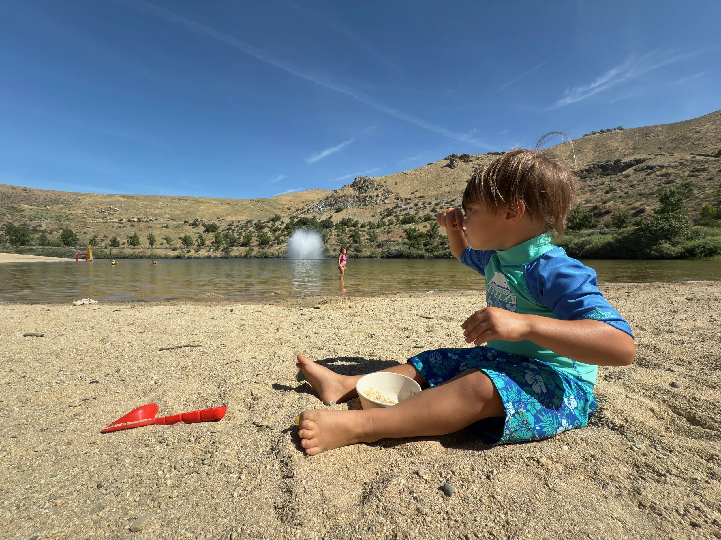 We drove to Lucky Peak State Park to have breakfast. On second thought, oatmeal might not be the best thing to eat at a sandy beach, but the kids didn’t seem to mind the extra crunch. This was a fantastic spot for small kids because the water was pretty shallow near the shore, and there wasn’t a current or waves. We were one of the first to arrive at the park and we enjoyed the quiet, family-friendly vibe. By lunchtime it got quite busy. We appreciated having access to outdoor showers, even if the water was cold.